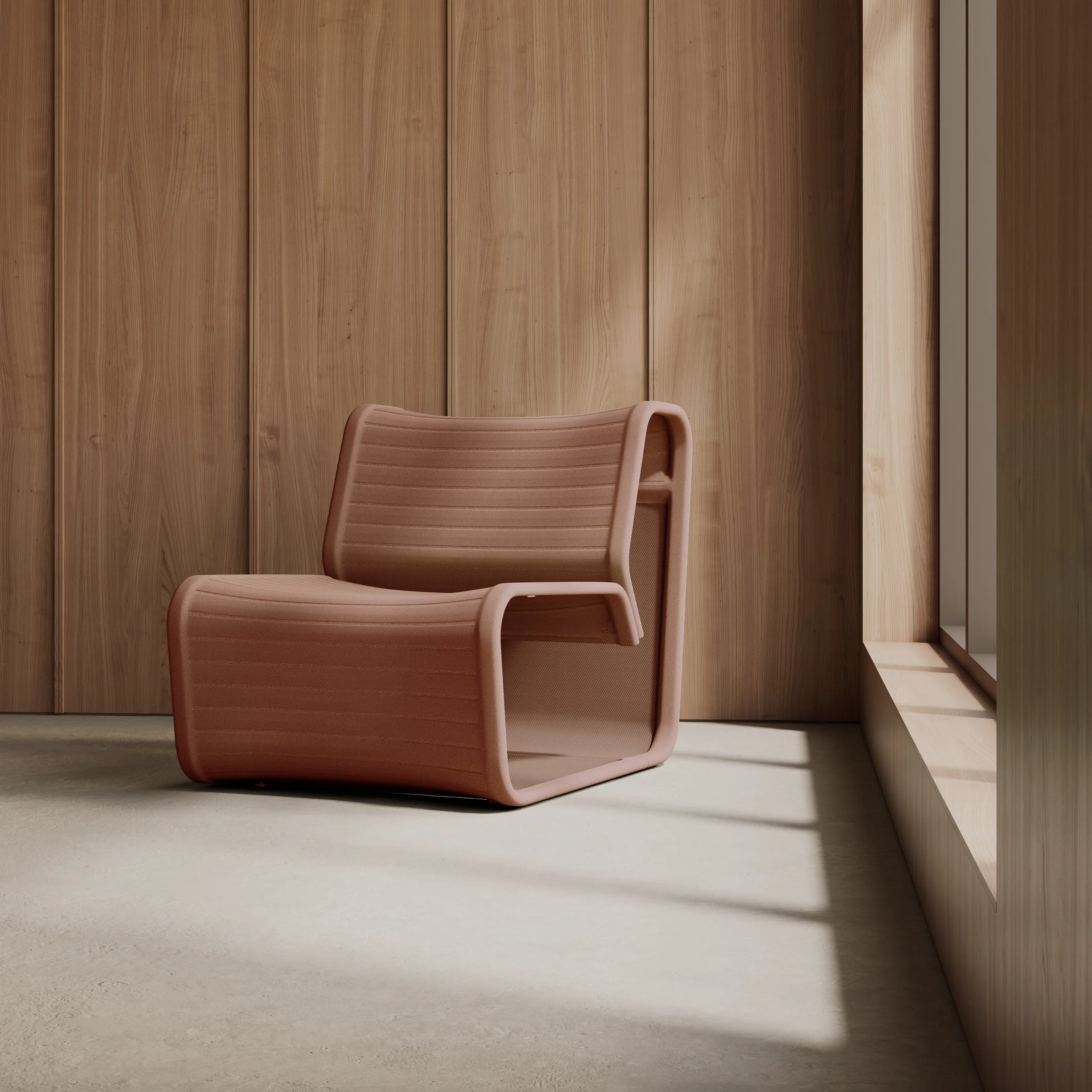 The fabric has been developed to feel opaque, textured and tactile, moving away from open mesh towards something more aligned with traditional upholstery. The ribbing design references stitched detailing in classic padded chairs while enhancing texture and structure.